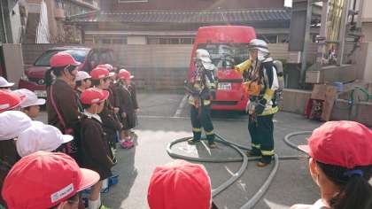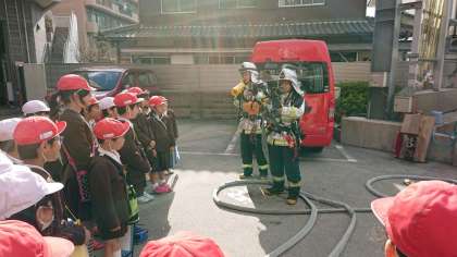 消防車からの放水作業を見学しました。隊員の方が素早くホースをつなぎ、放水する姿を見てとても驚いていました。また隊員の服装や、延長用のホースの説明などを聞き、教科書だけでは分からないことにとても興味を持って学んでいました。