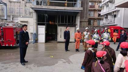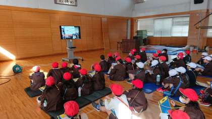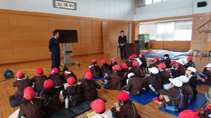 写真は講堂でのDVD鑑賞の様子です。隊員の訓練の様子や出動の様子を見て、気になるところはメモを取っていました。最後にはお礼の気持ちを込めてあいさつをしました。今日の体験からより身の回りの社会に興味を持ってくれればと思います。