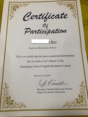 2月1日(土)住吉小学校にて、第1回大阪市長杯小学生英語暗唱大会が開催され、本校児童も市内小学生の30名に選ばれ出場しました。