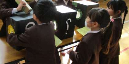「箱の中身は何入ってるんやろ?」とドキドキの1年生。