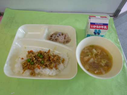 「鶏ごぼうごはん」は、しょうが汁で下味をつけた鶏ひき肉を主材に、つきこんにゃく、ごぼう、にんじん、グリンピースを混ぜたご飯です。