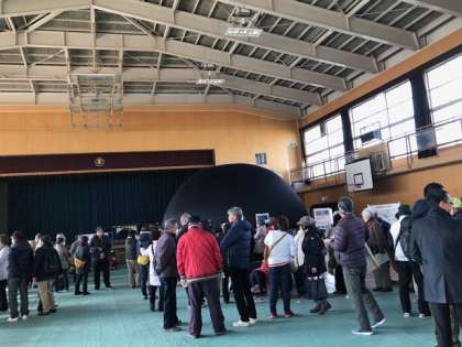 避難してこられた住民で、講堂の各体験コーナーはぎっしりです。小学生の姿もちらほら見受けられました。