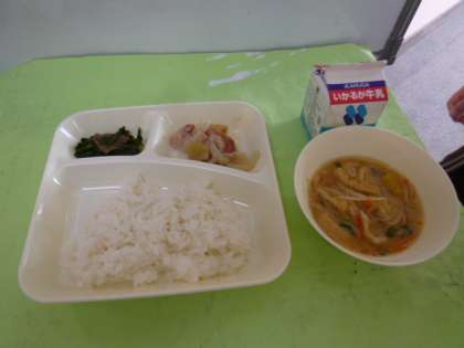 「さつまいものみそ汁」はさつまいも、うすあげ、にんじん、もやし、青みに青ねぎを使用しています。