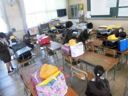 今日は初めての修了式でした。講堂には集まれないため、教室でテレビを通して春休みの過ごし方や校長先生の話を聞きました。その後、楽しみにしていたあゆみをもらったり、一年間使ったロッカーや靴箱などを丁寧に掃除しました。
