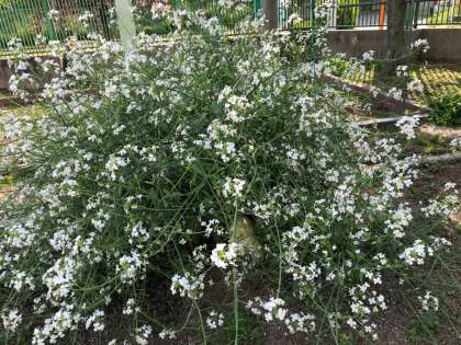 (写真1)休校が続いていますが、菅原小学校の四季は確実に移り変わっています。学習園の一角に目をやると、こんもりと生い茂るように、白い花が咲いています。