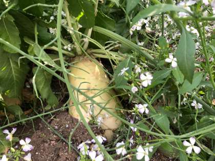 (写真3)そう、昨年度栽培し、種を取るために1本だけ収穫せずに残していた田辺大根です!たった一粒の種から、大きな実が育ち、花が咲き、種もたくさんできています。