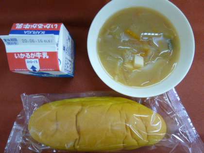 みそ汁は具だくさん(豆腐・キャベツ・たまねぎ・にんじん・オクラ)で、オクラのとろみがついて口当たりよくいただくことができます。