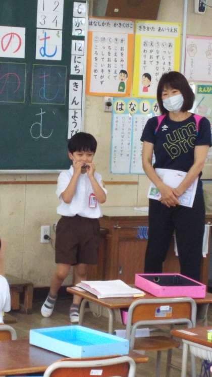 ひらがなの学習では、黒板に書いた文字のどこが間違えているかを発表し合い、同じ間違いをしないように気を付けて練習しています。