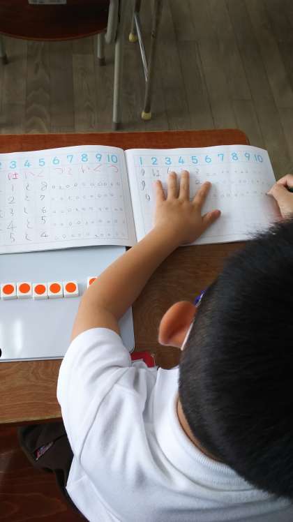 算数では、「いくつといくつ」の学習を、ブロックを使って確かめながらノートに書いています。みんな楽しく学習を進めています。