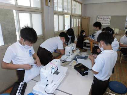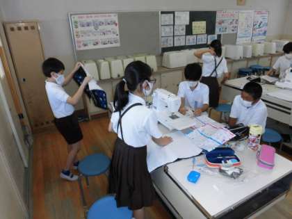 家庭科では、ナップザック作りをしています。子どもたちは、久しぶりのミシンの準備に四苦八苦。しかし、縫う腕前は衰えておらず、返し縫もお手の物。真っすぐ丈夫に縫うことができました。