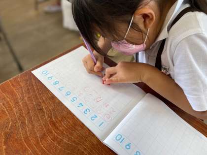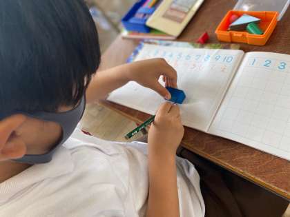 の形をしたブロックの縁をなぞり、絵をかきました。