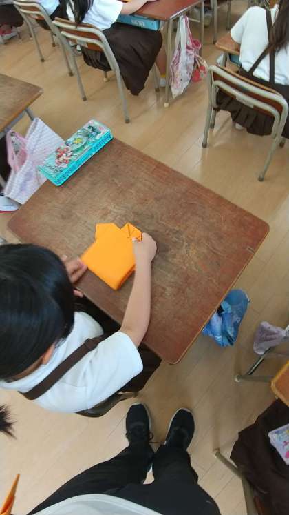 画用紙を折り紙のように折って、Tシャツを作りました。その後、パスで絵を描いたり、折り紙でネクタイや蝶ネクタイを作ったりしました。ネクタイや蝶ネクタイは、難しいところもありましたが、みんなで相談しあって上手に仕上げることができました。