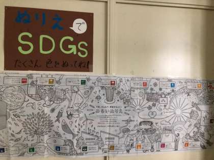 学校図書館補助員さんが、図書室前に「SDGs塗り絵」を掲示してくださいました。