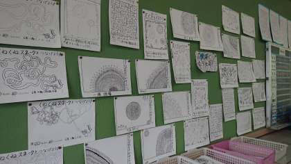 6年4組の線描画の掲示物です。