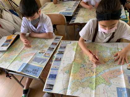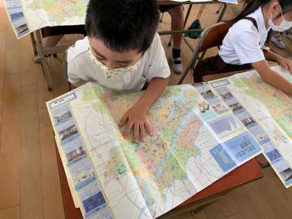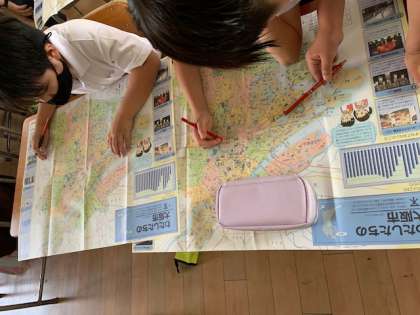 大阪市の地図を使って学習しました。「自分の住んでいる区はどこかな?」と探したり、川の場所や行ったことのある場所をみんなで探しました。最初は使い慣れていない地図に苦労していましたが、早く見つけることができた子が率先してお友だちに教えてあげていました。少しずつ地図にも慣れていってほしいなと思います。