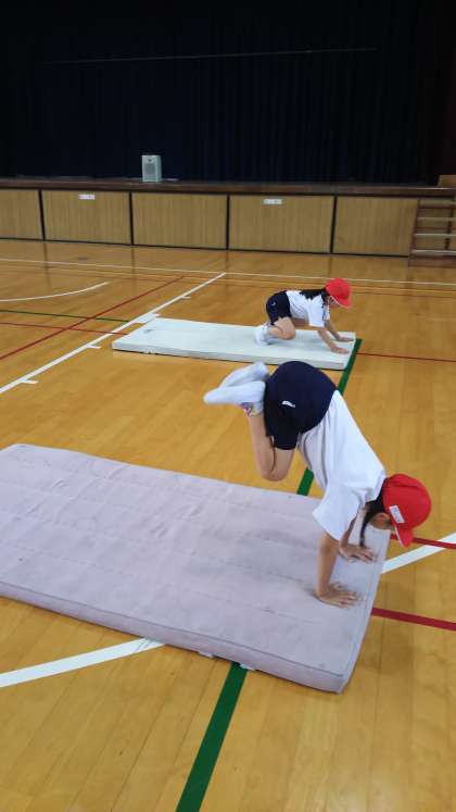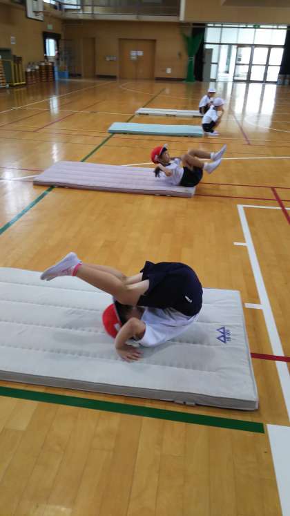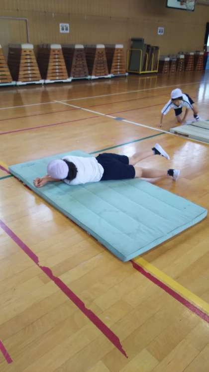 講堂の体育の学習では、マットあそびをしています。丸太転がりやかえるの足うちや前転がりなどを練習しています。マットの準備や後片付けも子どもたちだけでがんばっています。