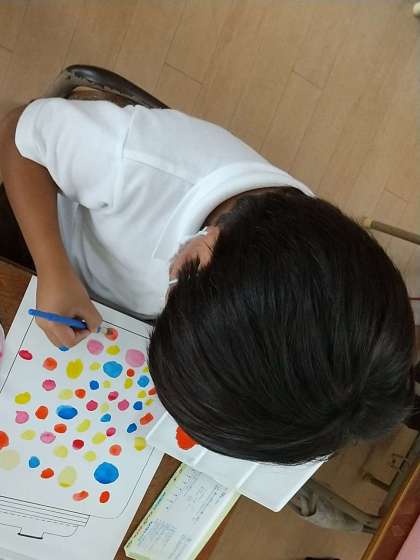 絵の具で、真ん丸なあめ玉を描きました。丸く描くことを意識したり、大きさを考えたりしながら、様々な色を使って描きました。美味しそうなあめ玉をたくさん描くことができました。