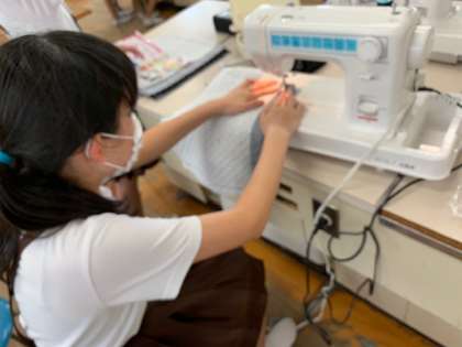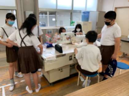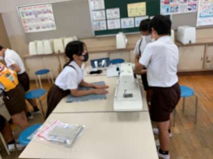 家庭科の時間にナップザックづくりをしました。みんなで教え合いながら取り組みました。