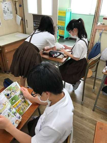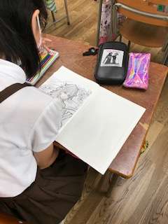 雨の日が続き、体を動かす機会がめっきり減っています。子ども達は、雨の日の休み時間をどのように過ごしているのでしょうか。6年1組の休み時間を覗いてみると、本を読む子、色塗りをしている子、友達と話しをする子、歴史カードでトランプをする子達も発見しました。それぞれ楽しんでいる様子でした。
