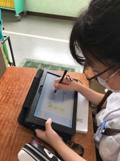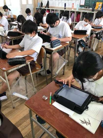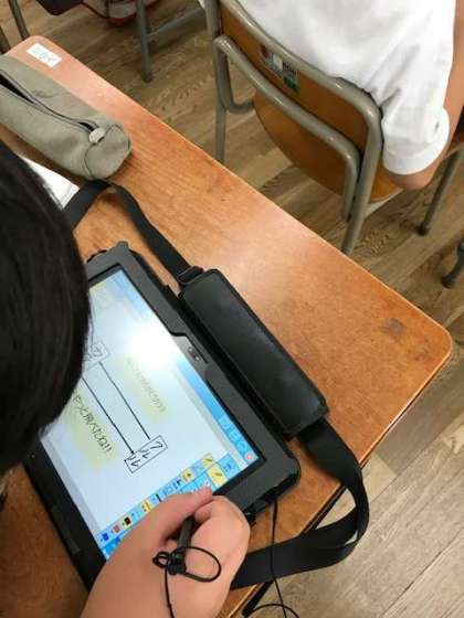 国語の学習「風切るつばさ」では、人物の関係をタブレットを使って図にまとめています。タブレットの中で友達の考えを共有することができるので、たくさんの良い考えや意見に触れることができます。パソコンやタブレットの扱いも、もうお手の物です。