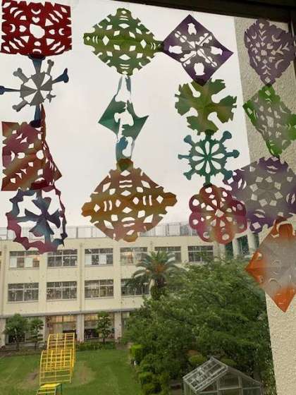 丁寧にはさみで切ってから、みんなの作品を窓に飾ると・・・とっても素敵♪ついつい窓を見てしまいます♪暗い空がみんなの作品で少し明るくなりました。