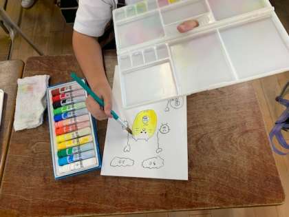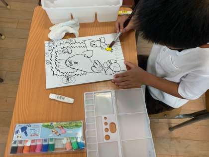 着色の続きです。自分の書いた下書きから絵の具がはみ出ないように。。。集中しながら取り組んでいます。どんな作品が出来上がるか今から楽しみです☆