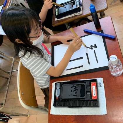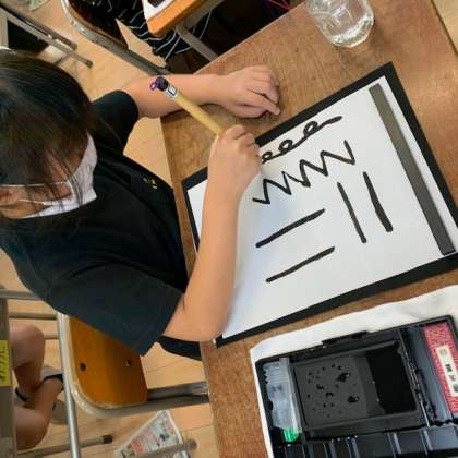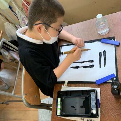 待ちに待った初めての初めての習字の学習です。準備の仕方をしっかりと聞いてから太筆を使っていろんな線を書いてみました。初めての墨汁にドキドキ。。。まっすぐ、ギザギザ、クルクルの線にチャレンジしました。半紙が真っ黒になるまで何度も書いていました。