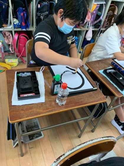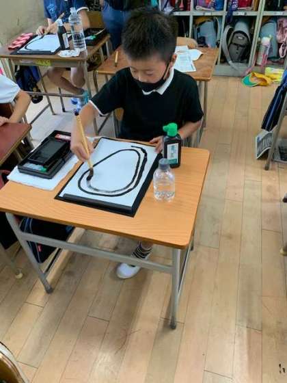 次は筆を一度も半紙から離さずに一筆書きで何周円を書くことができるか、チャレンジしてみました。思ったように筆を動かすことが少し難しかったようですが、真剣な表情で取り組んでいました。