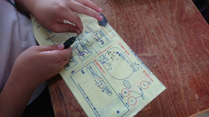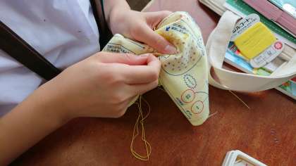 家庭科では、ソーイングの学習をしています。初めて針と糸を使って縫い物をした子どもたちも一生懸命に取り組んでいます。針に糸を通すのがなかなか難しいようで、悪戦苦闘しています。