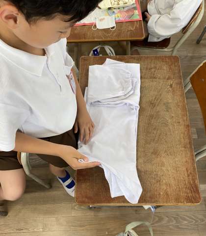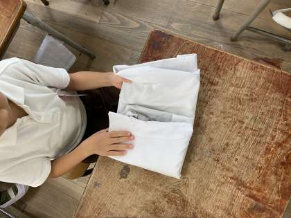 給食を食べ終わった人からエプロンを丁寧にたたんでいる様子です。