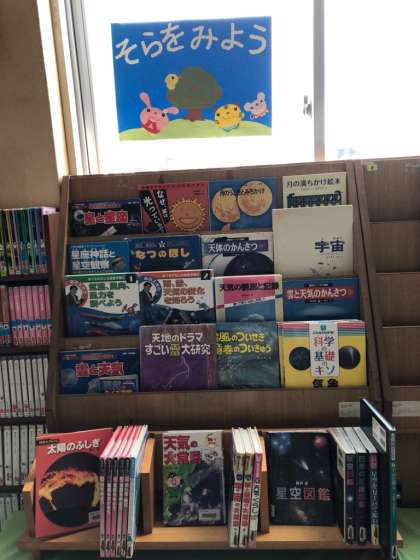 学校図書館補助員さんが、図書室の窓辺に、「そらをみよう」という特設コーナーを設けてくださいました。天気や宇宙に関する本が集められています。
