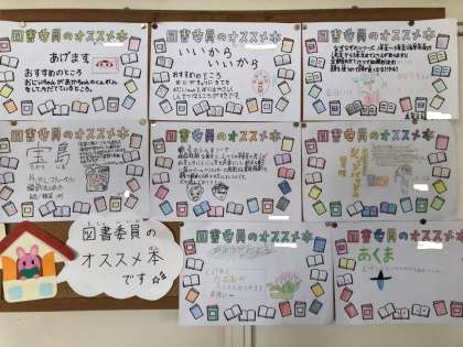 3枚目の写真は、図書委員さんの「おすすめの本」コーナーです。まだ休み時間や放課後の図書館開放をしていないのですが、掲示物をつくって、読書の呼びかけをしています。