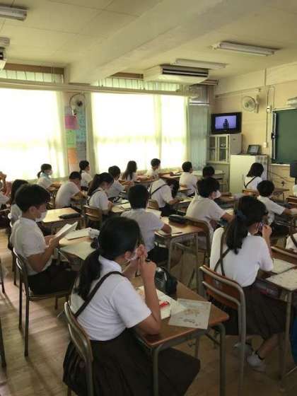 二学期が始まり、教室や廊下では元気な声が響いていました。写真はテレビでの始業式の様子です。