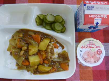 今日のカレールウには、小麦粉でなく米粉が使われており、小麦アレルギーのある子も食べることができました。大豆も入って、いかにもパワーがつきそうです。