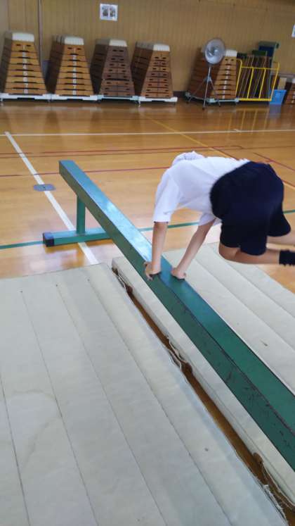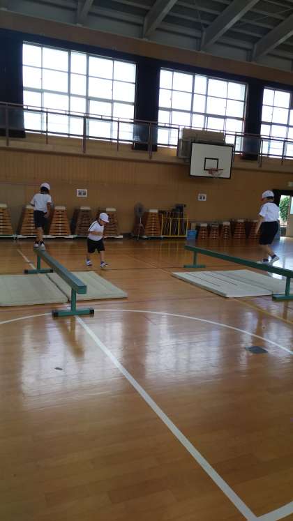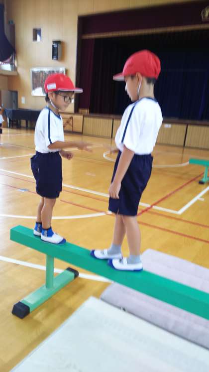 体育科では講堂で平均台をしています。前歩きや横歩きや後ろ歩きや大股歩き、とびこえジャンプや友達とじゃんけん遊びをしています。慣れてきてスイスイ進めているこどももたくさんです。