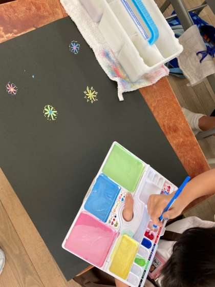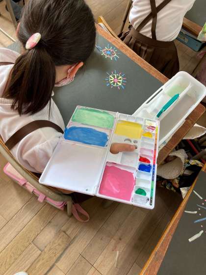 白色を混ぜて色をつくる練習や、ハンカチの学習を生かして細い点や線を描く練習を取り入れています。