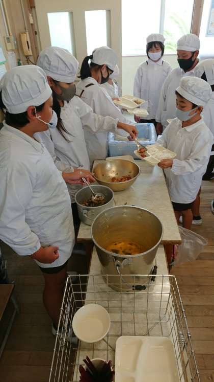 給食の様子です。好き嫌いのある子どもたちも少しずつ頑張って食べていたり、何度もおかわりをする子どもたちもいます。当番もテキパキと動いて準備をしています。