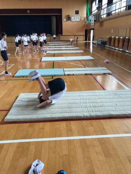 講堂ではマット運動をしています。タブレットを活用して、自分の演技を動画で撮影し、動きのチェックをしました。自分の演技をみることでレベルアップにつなげてほしいです。