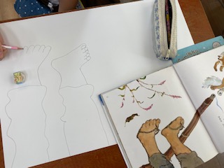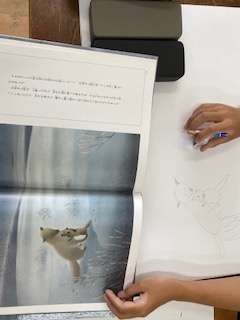 図工の時間に、自分の大好きな物語のお気に入りの場面を絵で表しています。