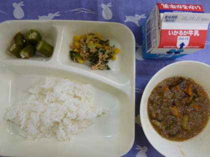 今日の給食には、なす・たまねぎ・人参・ピーマン・しょうが・オクラ・チンゲンサイ・コーンと、野菜が8種類も使用されています。