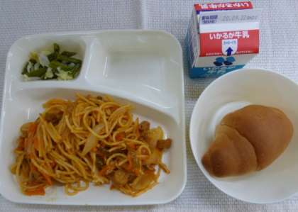 スパゲッティは、豚肉、ウインナー、人参、タマネギ、ピーマン、マッシュルームと炒めて、ケチャップ、トマトピューレ、ウスターソースで味付けされおり、なんだか懐かしい味がします。
