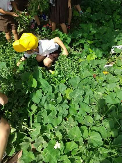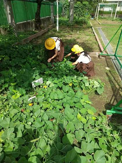 育てているサツマイモの畑に、夏休みの間に雑草が生えていたので、みんなで協力して抜きました。一生懸命抜いたので、とてもきれいになりました。美味しいサツマイモに育っていますように☆