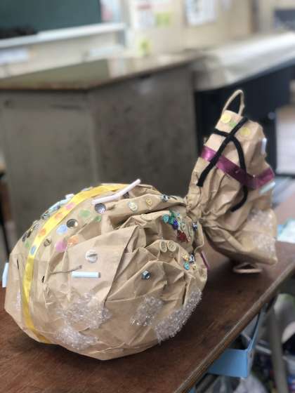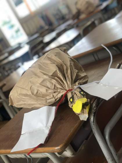 紙袋の中に丸めた新聞紙を入れた工作です。