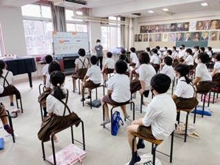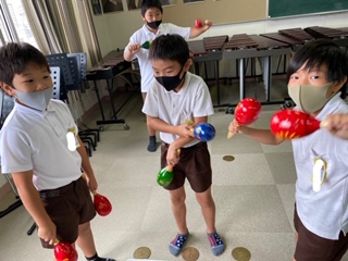 音楽の時間に楽器を使った演奏をしました。楽器を手にした時の子どもたちは目を輝かせていました。一方、演奏するときは真剣そのもの。リズムに慣れてくると、身体を揺らしながら楽しそうに合奏していました。