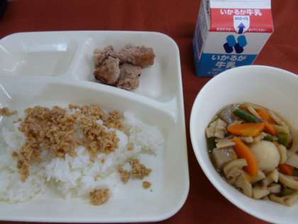 「吹き寄せ」とは、紅葉した葉が秋の風に吹かれてひとところに集まった様子を表しており、色とりどりの食材を煮て吹き寄せのように盛りつけた料理を「ふきよせ煮」といいます。秋の風情を感じる献立名です。