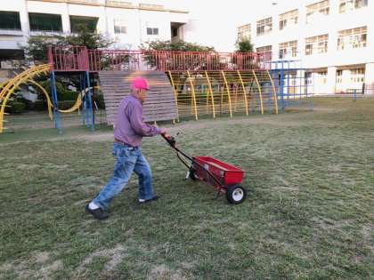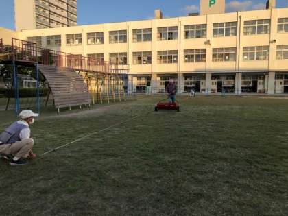 地域の「菅原小学校の芝生を守る会」のみなさんが、冬芝の種まきをしてくださいました。近くにいた児童も、ほんの少し手伝わせていただいて、とっても嬉しそうでした。