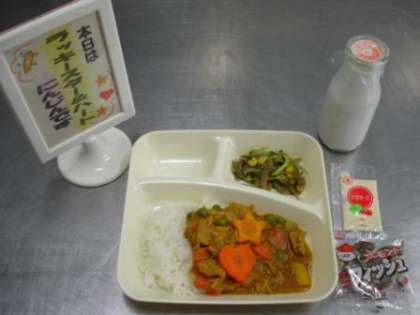 写真はこの期間に向け、本日の献立(ポークカレーライス)を「ラッキースター&ハートにんじん」として実施した給食時の様子です。