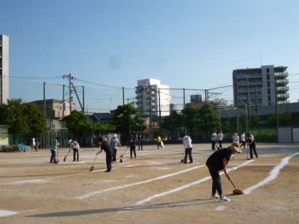 今日の放課後、教職員全員で、「にがりまき」を行いました。砂ぼこりを抑え、グランドコンディションを整えます。