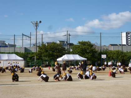 21日のスポーツ交流会に向けて、5・6年生が石拾いをしました。