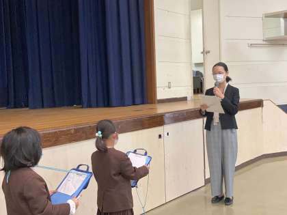 代表の児童が、インタビュー形式で職員の方に聞きたいことを質問させてもらいました。